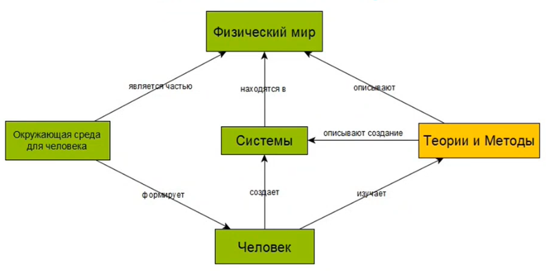Человек изучает теории и методы. Создает различные сложные системы - машины, самолеты, роботов, которые находятся в физическом мире. Окружающая среда также влияет на человека. В Системном Мышлении мы изучаем теории, практики, методы, дисциплины чтобы привносить новые системы в физический мир для того чтобы его изменить. Системное Мышление позволяет из разных картин мира собирать систему, которая будет удовлетворять потребностям разных проектных ролей.