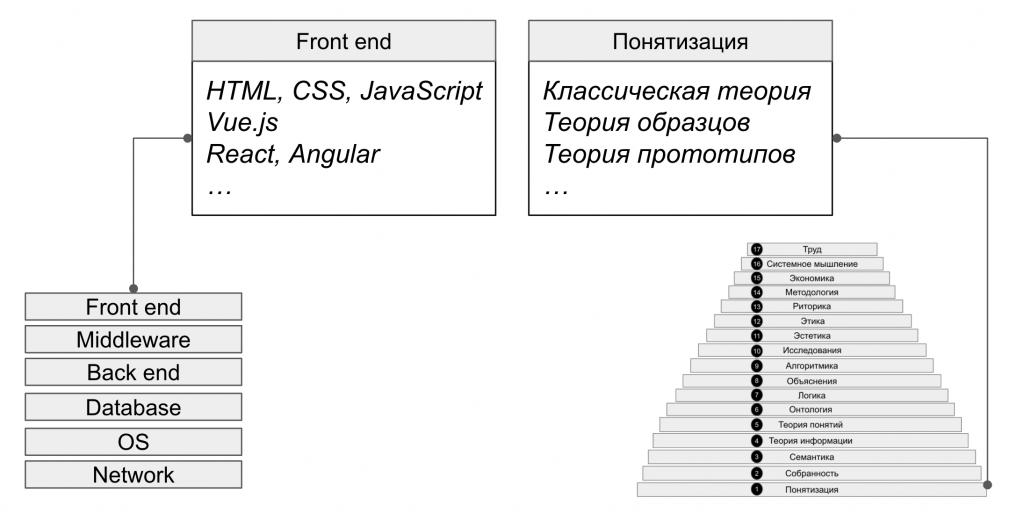 Трансдисциплины интеллект-стека как целое отвечают за работу мышления. Каждая из дисциплин рассматривает изолированный (функционально специализированный) аспект мыслительного мастерства. Представление об этом аспекте дают понятия трансдисциплины и располагаемый ею набор теорий. Знакомясь с новыми теориями и расширяя набор понятий, практик соответствующего мыслительного мастерства усиливает свой интеллект. Похожесть устройства стека технологий и интеллект-стека показана на Рисунке 2.