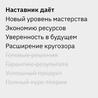 Новое мастерство. Главный результат обучения — это новый уровень вашего мастерства. После работы с наставником вы сможете делать то, чего раньше не делали или делали медленнее, дороже или с большими усилиями. Наставник обратит ваше внимание на важное и на то, чего можно не заметить самому. Или придется затратить много времени, ресурсов и нервов, чтобы “докопаться до истины”.