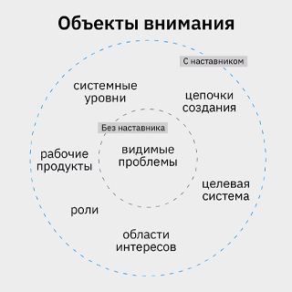 Наставник буквально обращает ваше внимание на определенные понятия, идеи и смыслы, рабочие продукты и системы. При этом он показывает, как они связаны между собой, объясняет подводные камни. Поэтому мы рекомендуем следить и записывать объекты внимания, которые получили от ментора. Это важный результат наставничества.