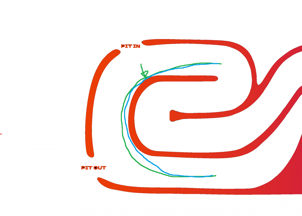 - Описание: в предыдущих тренировках было много держака, поэтому можно было его “облизывать”: еще в первой половине прижиматься к внутренней его части и проезжать всю дугу внутри с небольшим подсбросом газа посередине. Апекс (самая внутренняя точка поворота) все равно поздний - на 2/3 - 3/4 дуги примерно. В этой же тренировке держака было мало и надо было делать классический поздний апекс с длинным заходом (зеленая линия); а я пытался прилипать по синей линии и в середине дуги меня выносило наружу - приходилось сильно сбрасывать