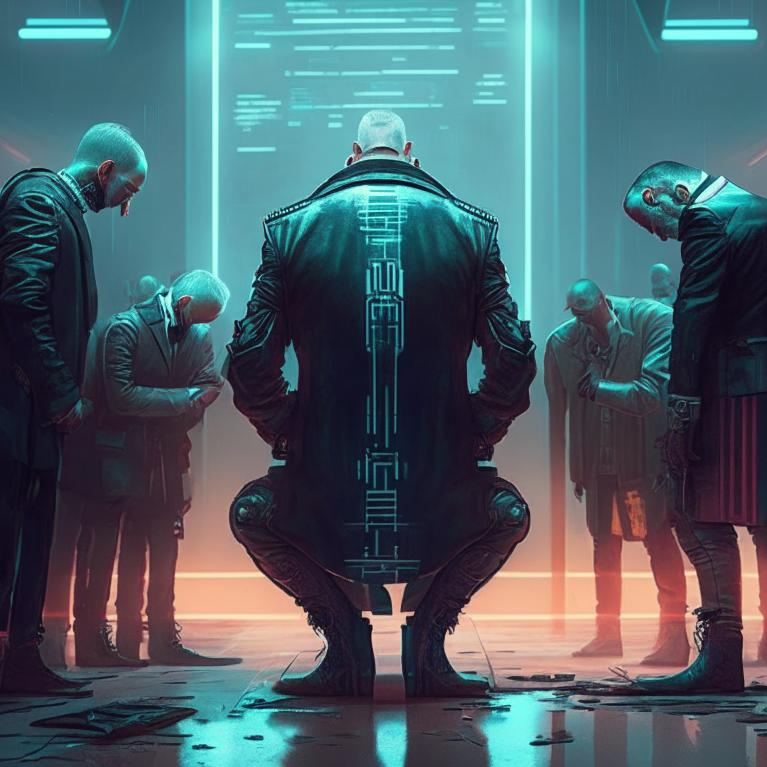 И опять не удержался, киберпанк-иллюстрация от Kandinsky 2.1, промпт "администратор строго выговаривает пришедшим ему на поклон сотрудникам предприятия".