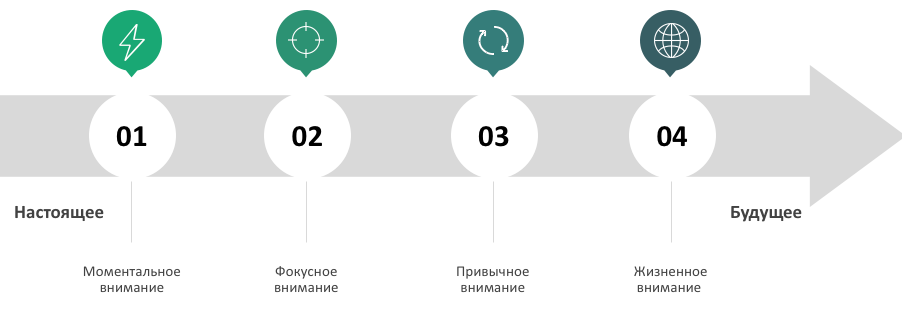 На следующей картине размещены первые четыре уровня внимания на временной шкале от настоящего к будущему: