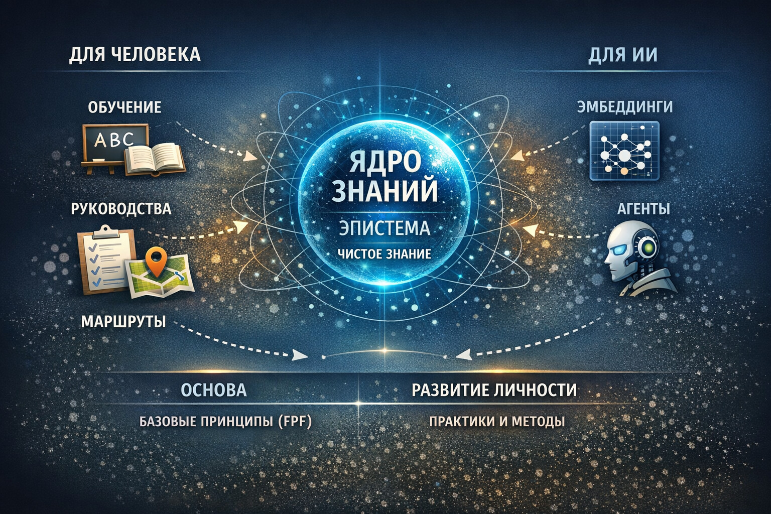Ключевая идея: Знание может и должно существовать независимо от способов его использования. Эпистема не является программой, не задаёт порядок освоения, не ориентирована ни на человека, ни на ИИ, не предполагает сценария. Обучение, руководства, персональные маршруты, ИИ-агенты — это вторичные сборки из эпистемы. Не наоборот.